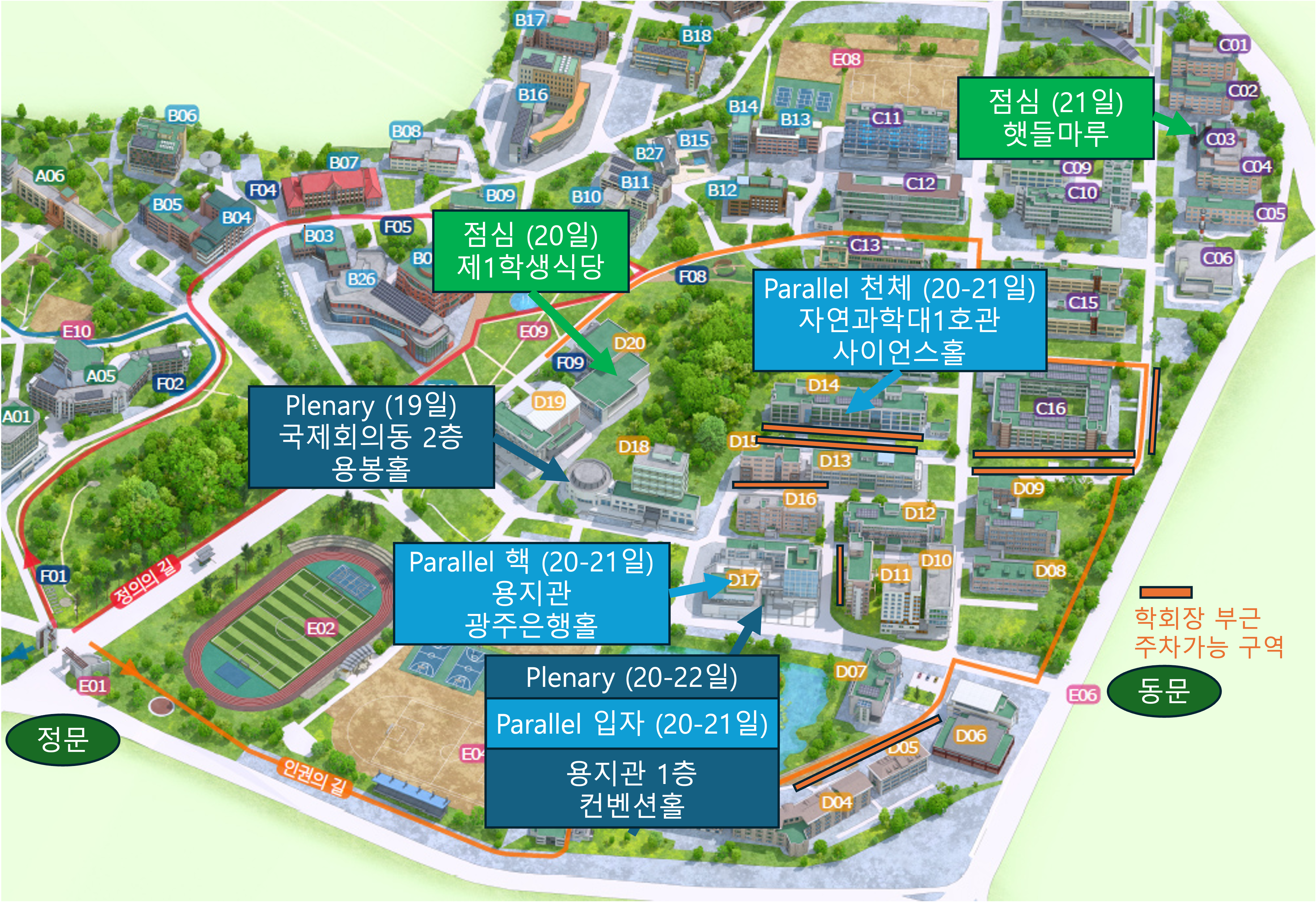 - 핵물리학 분과 : 용지관 광주은행홀 (D17, 용지관): 1층 컨벤션홀에서 엘리베이터를 타거나, 건물 밖으로 돌아 계단으로 올라가면 됩니다.